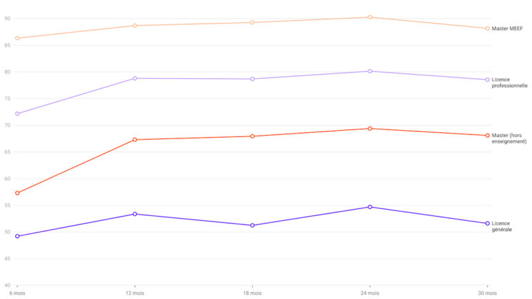 Du côté de la licence, les chiffres sont légèrement plus faibles, mais restent néanmoins en hausse par rapport à 2024. La voie générale offre un taux d’insertion de 58%, dans l’année qui suit l’obtention du diplôme, tandis que la licence professionnelle monte en flèche pour atteindre les 80%.